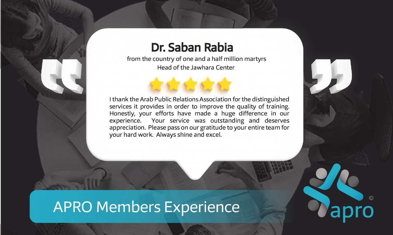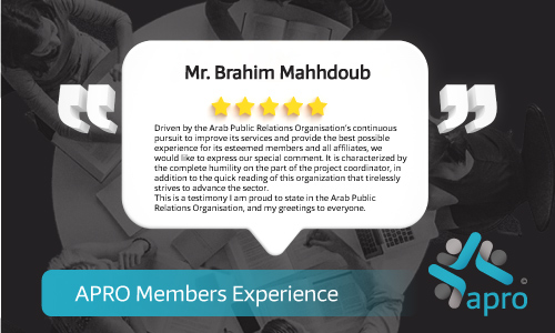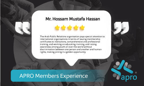 APRO has created the Super PR Excellence Award honoring and celebrating its distinguished members. This title is granted based on several standards and requirements, and after announcing the opening of the door for candidacy for those wishing to do so, and presenting them for their achievements during the year, whether in the frame of joint work with the association, or for their distinguished activities in our field of interest in general. This award comes within the context of the association's adoption of a policy of upgrading and praising the efforts of its members, and in support of it to reward every hardworking person, actor, and interested in our association. This title provides its owner with several privileges granted by the management of the association; It is represented by a permanent free membership in the association, marketing support on all the association's media channels, a certificate of excellence award documented by the association's management, and an official accreditation certificate issued by the association.